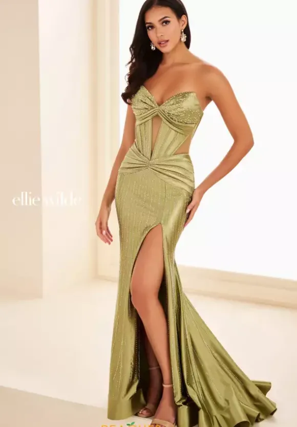 Look sleek and sophisticated in this stunning long fitted gown by Ellie Wilde style number EW37011. This elegant dress features a classic strapless V neckline with a key hole cut out in the center. Separate Spaghetti Straps Included. The entire dress is made out of a comfortable stretch knit material with gorgeous beadwork all over.
