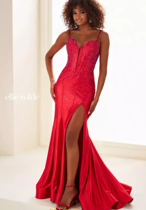 Perfect for your next social occasion this glistening Ellie Wilde long dress style EW37069 is offered in a variety of beautiful colors of stretch knit embellished with hot fix stones. This sparkling gown features a corset bodice with adjustable shoulder straps, visible boning, illusion front panel and lace up tie back. The long slim fitting skirt has a horsehair hem edge with sweep train and high front side slit.