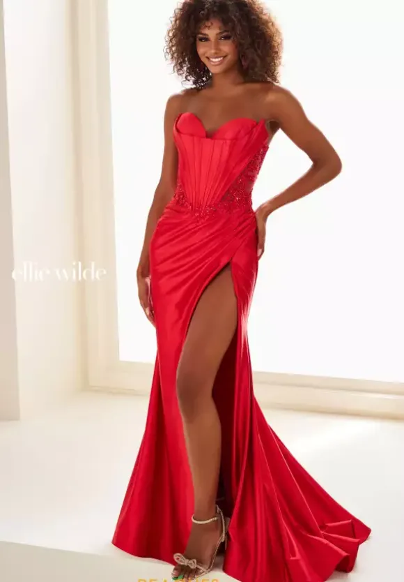 Feel sleek and glamorous in this strapless fitted dress from Ellie Wilde style EW37084. This stretch knit fabric dress hugs your figure with a strapless sweetheart neckline bodice comes with detachable spaghetti straps.. The bodice has boning detail with sheer illusion side cut outs. The fitted long skirt has an adjustable zipper slit.