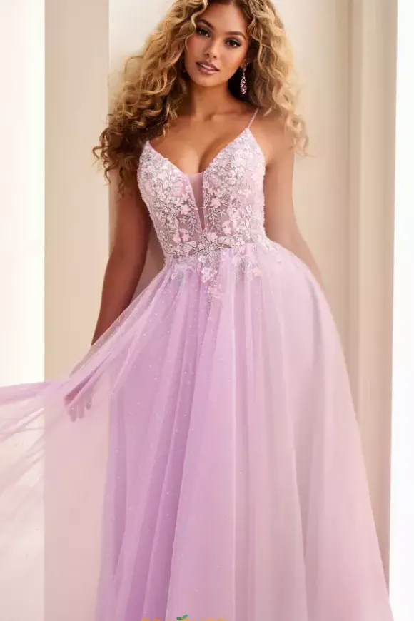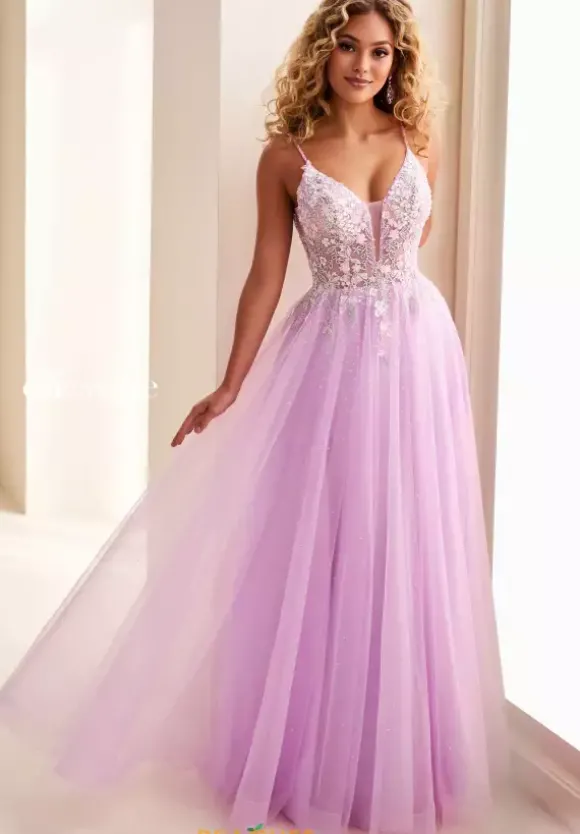Float across the dance floor in this a line dress from Ellie Wilde style EW37096 at your prom. The v neckline sheer illusion bodice is embellished in sparkles and floral details that is mocked in the v back. The flowing tulle skirt has hints of sparkling glitter throughout with pockets on the sides.