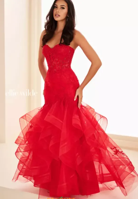 Show off your unique sense of style in this fitted mermaid style gown by Ellie Wilde style number EW37113. This fun and flirty dress features a classic strapless sweetheart neckline with a semi sheer bodice that is embellished in darling applique sparkling beads and lovely lace. The voluminous show stopping skirt is made out of glitter tulle.
