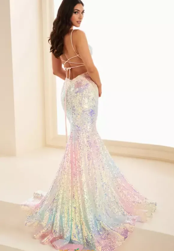 Have a cotton candy shimmer in this tasteful Ellie Wilde sequin encrusted cotton candy colored prom dress style EW37220. The body con dress hugs all of your curves and features seductive sheer lace trim along the sides of the waist. The sequin encrusted color shifting sequins endlessly sparkle all the way down to the dramatic long rainbow sweep train.