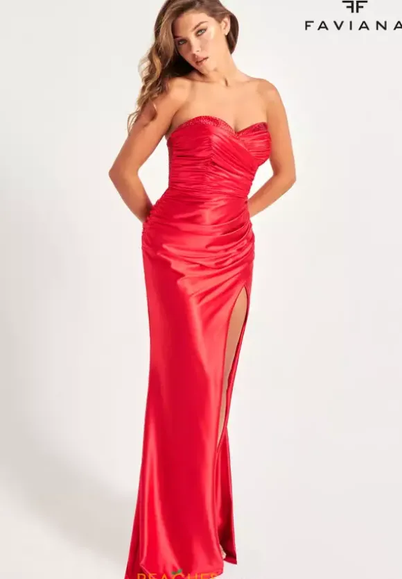 Captivating and lush gown by Faviana style 11009 is made out of elegant stretch satin material, made even more sophisticated with ruching along the strapless bodice. The bust displays a peek of glamorous, shimmering beading that playfully mimics the beaded back style. A side slit and a train is simply a must.