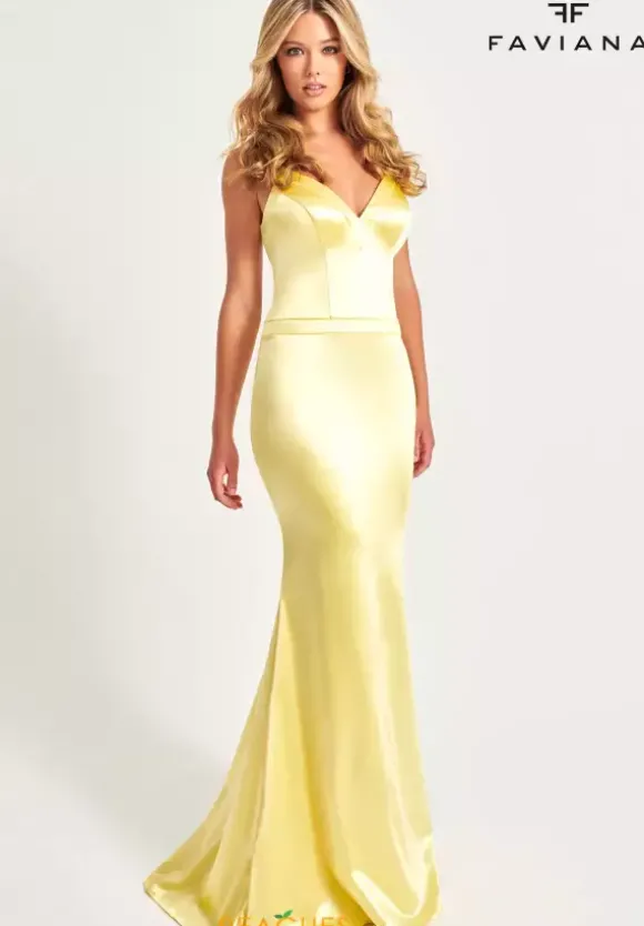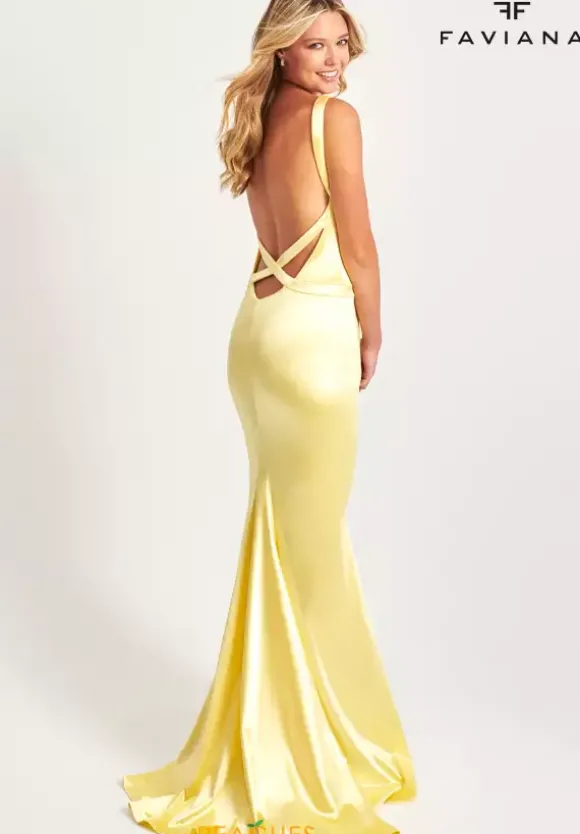 Look absolutely gorgeous at your prom wearing this celebrity inspired Faviana long dress style 11052 offered in beautiful shades of stretch satin. This phenomenal gown showcases a fitted bodice with V neckline, thick straps and low open back with crisscrossed detailing. The long curve defining skirt has a sweep train.