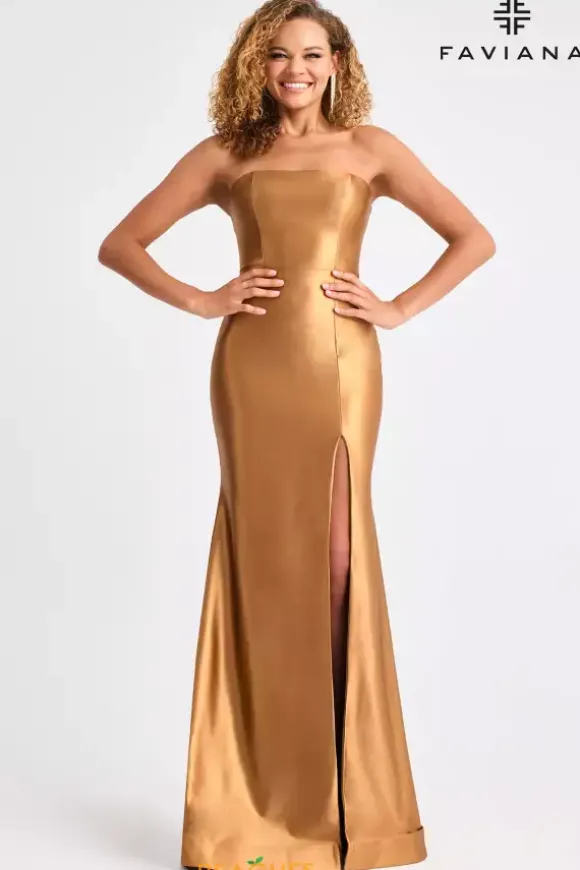 Simple is always more in this truly elegant long dress by Faviana, style 11211. Sleek and sophisticated, this dress showcases a classic strapless neckline and sexy corset lace up, giving you an eye catching open back. The slit and long train finish off this stunning look while the entire dress is luxurious stretch satin material.
