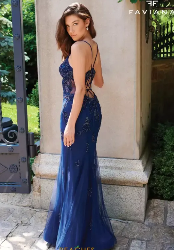 Draw the attention immediately wearing the remarkable long style 11227 by Faviana. The lovely top features a v neckline and displays a fascinating open back detailed with a tie lace corset to instantly snatch the waistline. Made in a trumpet silhouette and beautifully adorned with intricate clusters of applique and beadwork.