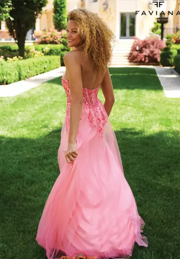 Make the statement of the season with the bold long style 11233 by Faviana. The strapless straight across neckline displays an illusion bodice embellished with sweet floral applique that meticulously trickles down the small of the waist and finishing perfectly along the beautiful flowing tulle skirt.
