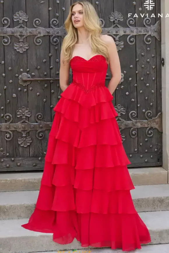 Amp up the drama in this long a line dress designed by Faviana style, 11460. This dress displays a strapless corset bodice with a striking sweetheart neckline detailed with stunning beadwork and applique along the waistline. The skirt is made up of chiffon material and ruffle layers leading to a long train, adding an extra touch of glam.
