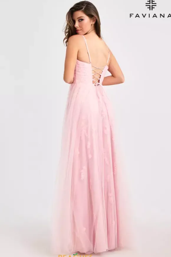 Show off your girly side in this flowy Faviana a line dress style 11471. This scoop neckline dress has spaghetti thin straps that are adjustable. The back of the bodices has lace up for a snug fit. The flowing tulle a line skirt has appliques scattered through out with a front side slit and pockets