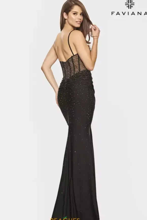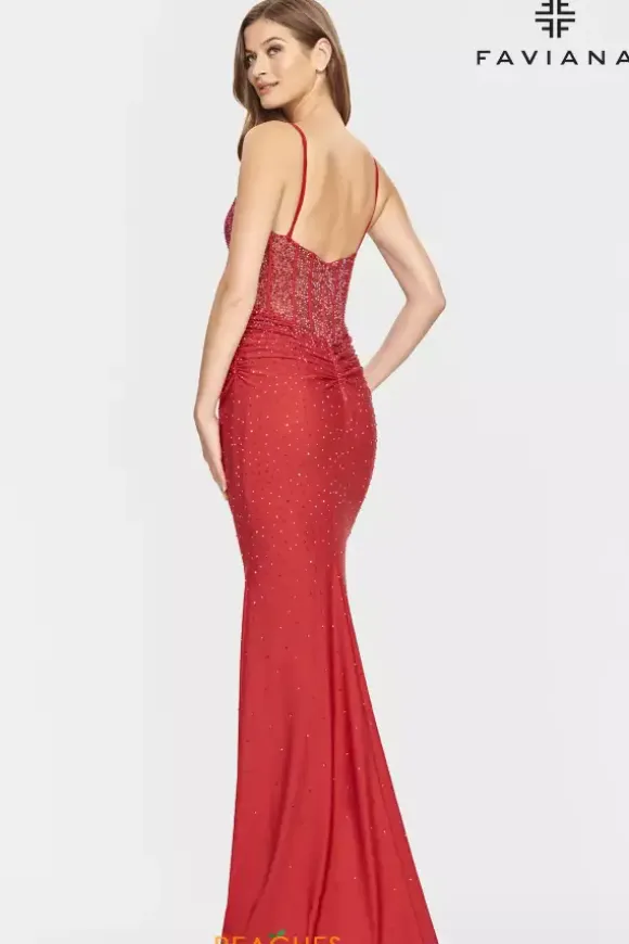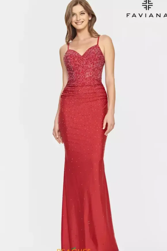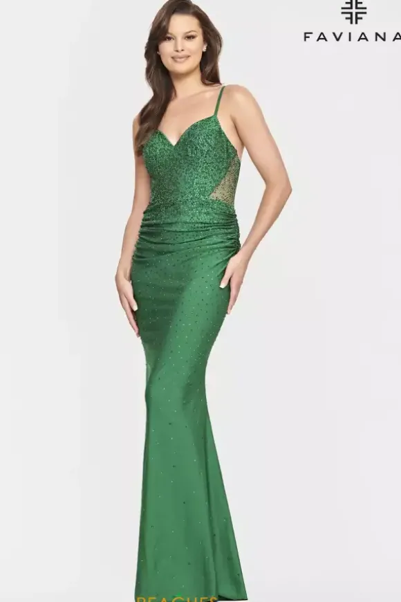 Sparkle from all angles in this fitted charmeuse Faviana dress style S10800. Available in bold, rich colors, this dress is fully adorn from the bodice and trickles down to the hem with hot stone rhinestones. The v neckline and thin shoulder straps that connect to the sheer illusion back. Gather in and ruching make this dress ultra flattering.
