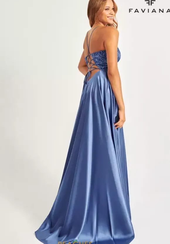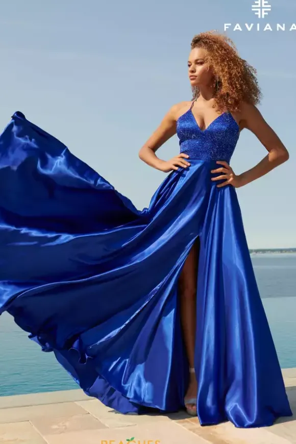 Create a whimsical entrance when stepping foot into your event wearing the lovely long style S10870 by Faviana. The fully bedazzled illusion top will really steal the show. Along the small of the waist starts the flare of the charmeuse flowing skirt that will really add a dramatic factor to all your photos.