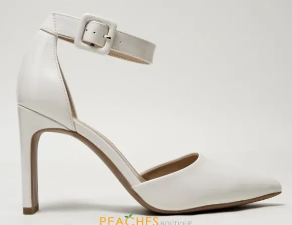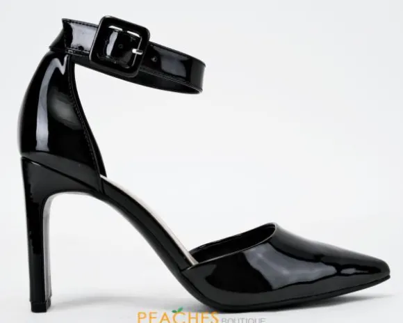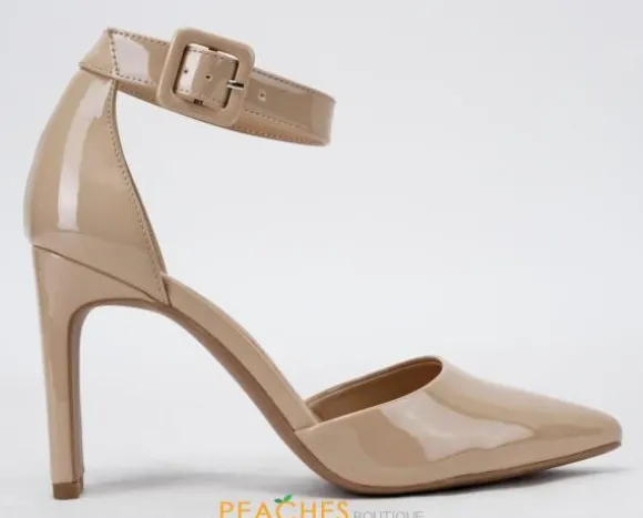 Rock these shiny and sleek pumps by Fortune Dynamic in the style Usage at your next event. These closed pointed toe heels come in a black patent, dark beige, off white, or red patent color. Made with an ankle strap, these heels are perfect for keeping you secure and comfortable all night long. Pair these with your peaches dress for the ultimate look.