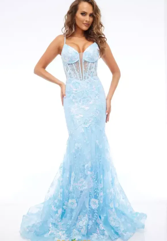 Show off your hour glass figure in this amazing Jasz Couture fitted long dress style 7657. The sheer illusion corset style bodice has exposed bone work and dual thin straps that turn into a lace up in the back. The fit and flare style skirt is embellished with floral inspired appliques completed with a long train.