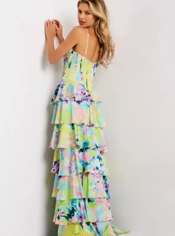 Have all heads turning wearing remarkable long style 47560 by Jovani. Featuring the fitted bodice detailed with the waist snatching corset bodice displaying applique and pleating along the sweetheart neckline. Flowing into a dramatic skirt showcasing multiple layers of ruffles followed with the alluring thigh high slit and lovely train.