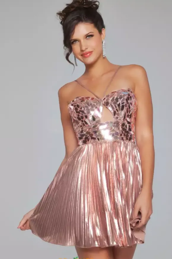Shine the night away in this lovely pink and rose gold short dress made by Jovani, style 40351. This A line style has a wonderful V shaped neckline that is paired perfectly with the various cut glass details that are placed on the bodice of the dress. The bottom of this dress is made with glistening lame material as well.