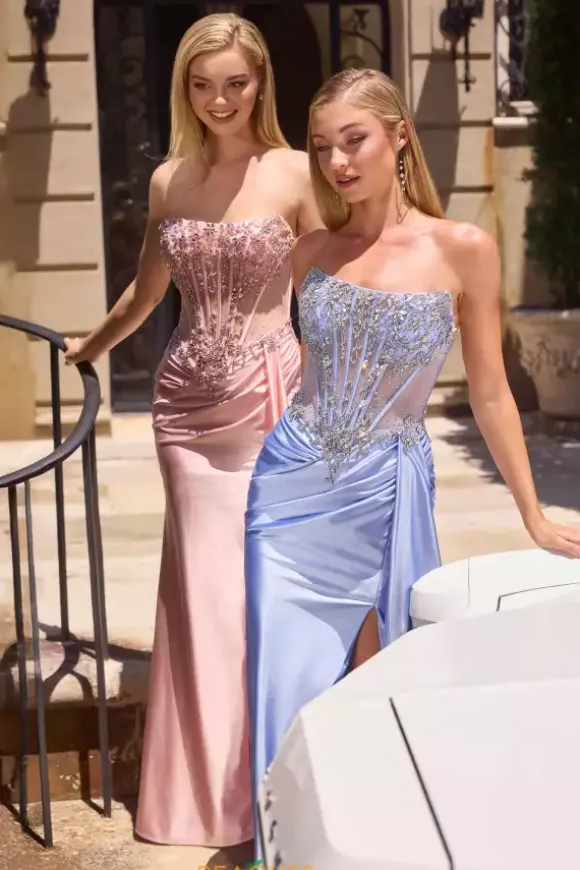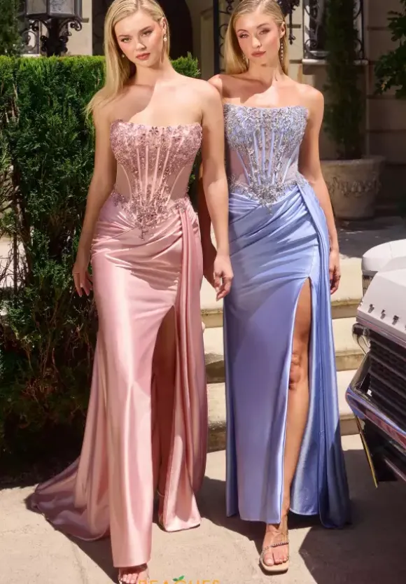 Strut with confidence when you wear this figure flattering La Divine by Cinderella beaded floor length prom dress style 106C169. This on trend style consists of a strapless zipper corset bodice adorned in glistening beads and appliques that gleam against the luminous ruched stretch satin thigh high slit skirt.