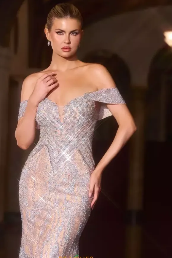 This intriguing La Divine by Cinderella prom dress style 106CD693 will turn heads at your upcoming event. Beaded detachable draped sleeves complement the fully beaded plunged bodice where horizontal zigzag beadwork highlights your waistline. The glittering long skirt is adorned in a whimsical glitter encrusted design.