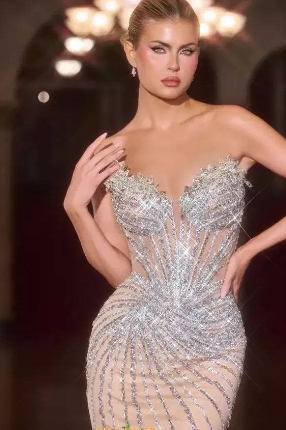 Make a statement in this one of a kind La Divine by Cinderella prom dress style 106CD715. This striking skin tight dress boasts 3D floral appliques that rise from the strapless plunged neckline and match the shimmer of the swirl detailed fitted skirt. The swirl beadwork unwinds into several glistening rows of beads.