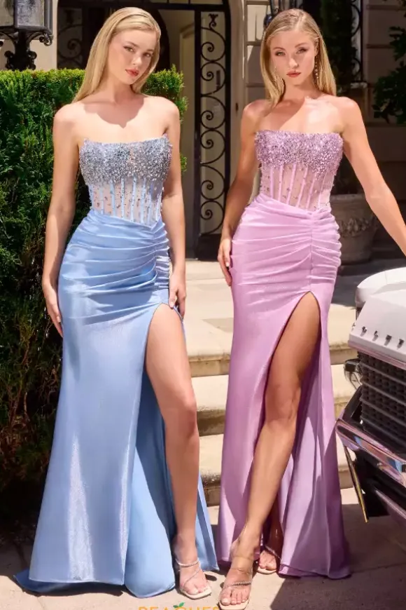 Be adorned in vivid color when you dress your curves in this head turning La Divine by Cinderella ruched prom dress style 106CW301. The glimmering strapless scoop neckline is drenched in silver and color matching gemstones that lightly coat the paneling of the fitted corset bodice. The silky stretch satin skirt flaunts gathering at the seam of the thigh high slit to ensure regal detail.