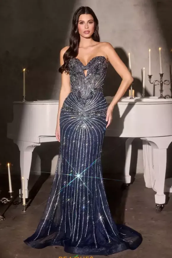 Make a statement in this bold and luxurious La Divine by Cinderella skin tight beaded prom dress style 106KV1139. This strapless gown falls into a medium length horsehair hem sweep train and is entirely garnished in color reflective stone accents that have been meticulously sewn to perfection down the boning and paneling of the corset bodice and figure enhancing fitted skirt.