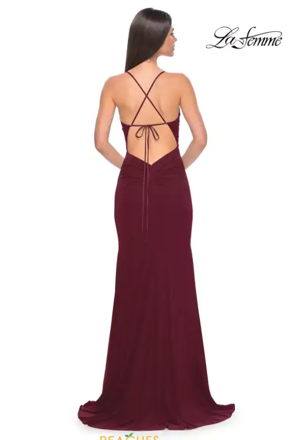 Find the perfect dress for any occasion with this amazing and elegant fitted style dress by La Femme, style 311151. This dress has a stunning transparent corset, a lavish V shaped neckline, and a gorgeous high slit that brings the entire look together. The simplicity of this dress is what stands out the most as it is made with no beads and net material.