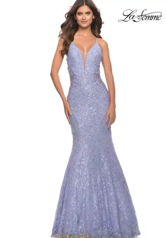 Stunning and elegant, La Femme style 31354 displays delicate lace material made glittering with beading. What makes this gown pop are side cut outs adorned with pretty floral applique. Displaying a plunge V neckline with a mesh covering, with slim straps that cross in back and forms a small corset. The skirt flares for a mermaid silhouette.
