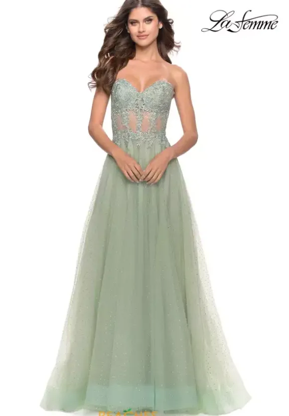 Graceful and enchanting La Femme style 31367 blends lace and tulle for an ethereal look. Displaying a sweetheart strapless neckline for the lovely fitted bodice, beautifully adorned with lace made glittering with beading. The tulle skirt flares out for an A line cut, also decorated with pretty beading.