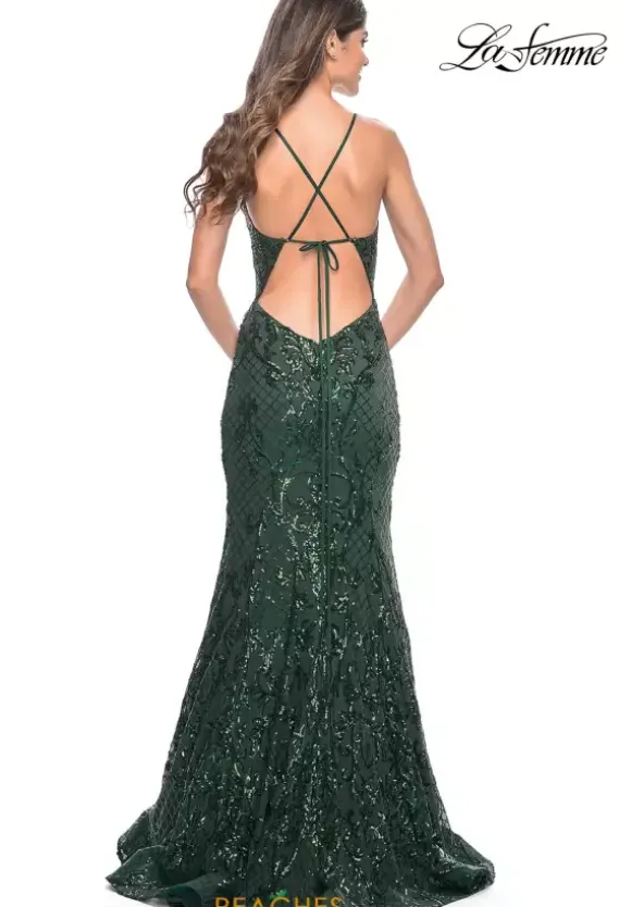 Be the center of attention in this La Femme dress 31943, a ravishing gown perfect for your senior prom. Showcasing a low v neckline, dainty thin straps give this gown a sense of comfort and style. Gleaming sequins adorns the entire ensemble highlighting an elaborate design. The flattering lace up closure accentuates your figure, while the alluring mermaid silhouette highlights your curves.