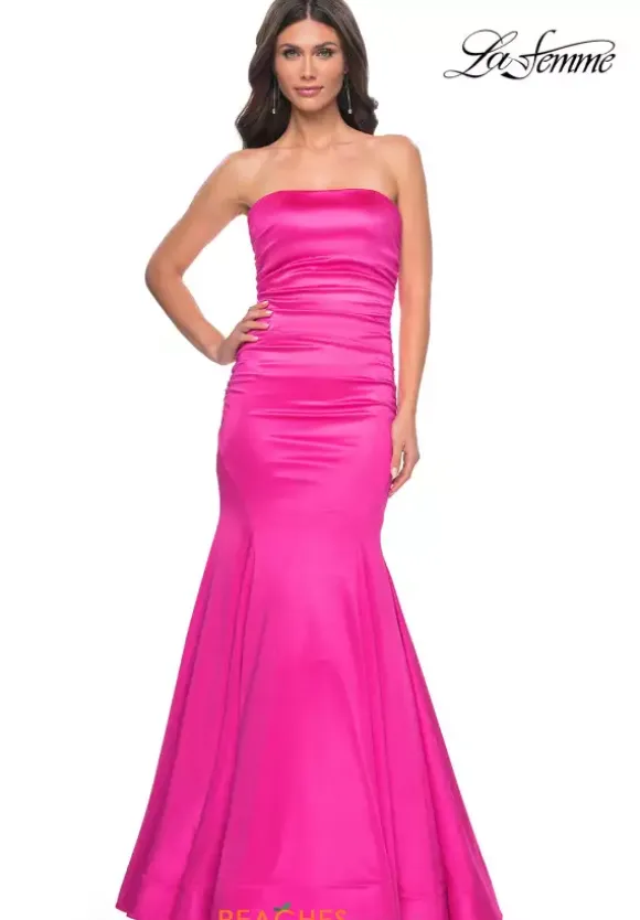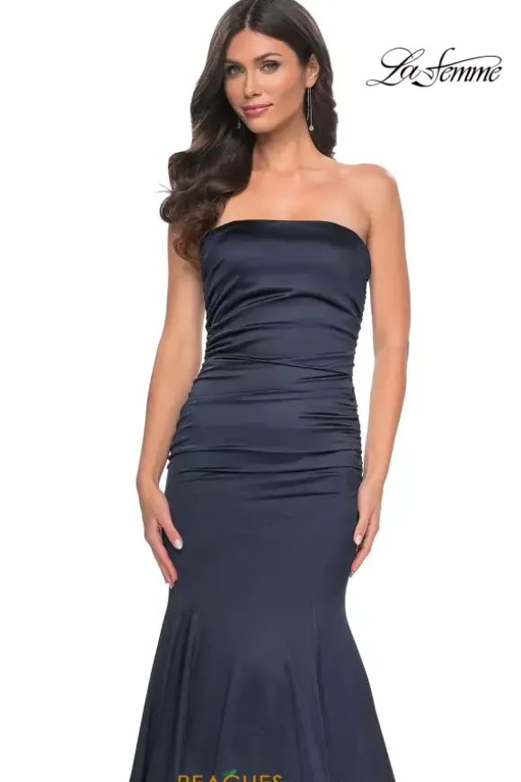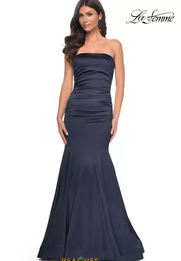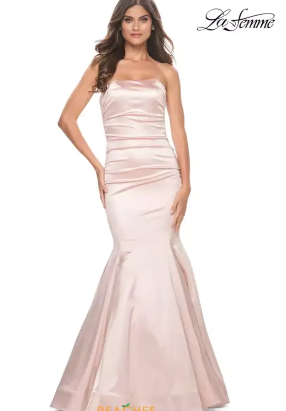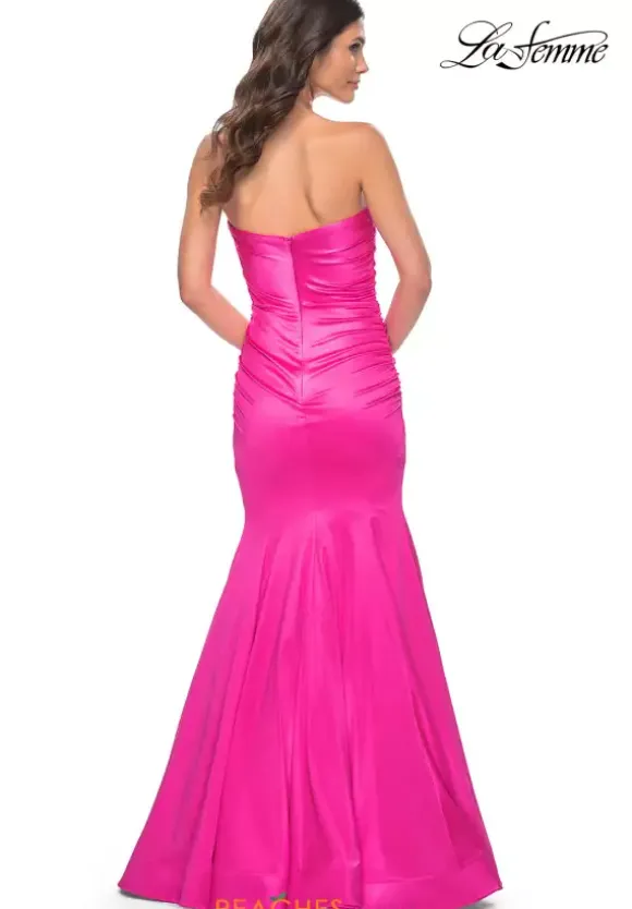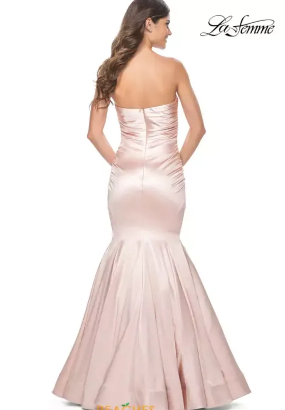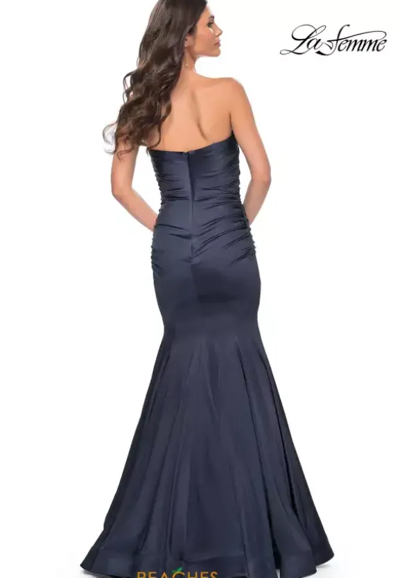 Fun and fabulous, this fascinating La Femme style 31980 will captivate all in sight. Classic and sophisticated, this gorgeous style features a modest strapless neckline and long fitted silhouette. Flattering on all figures, beautiful ruche detailing adorns the dropped fitted bodice accentuating your curves. Made in a sleek jersey fabric, the flattering mermaid silhouette makes for a memorable exit.