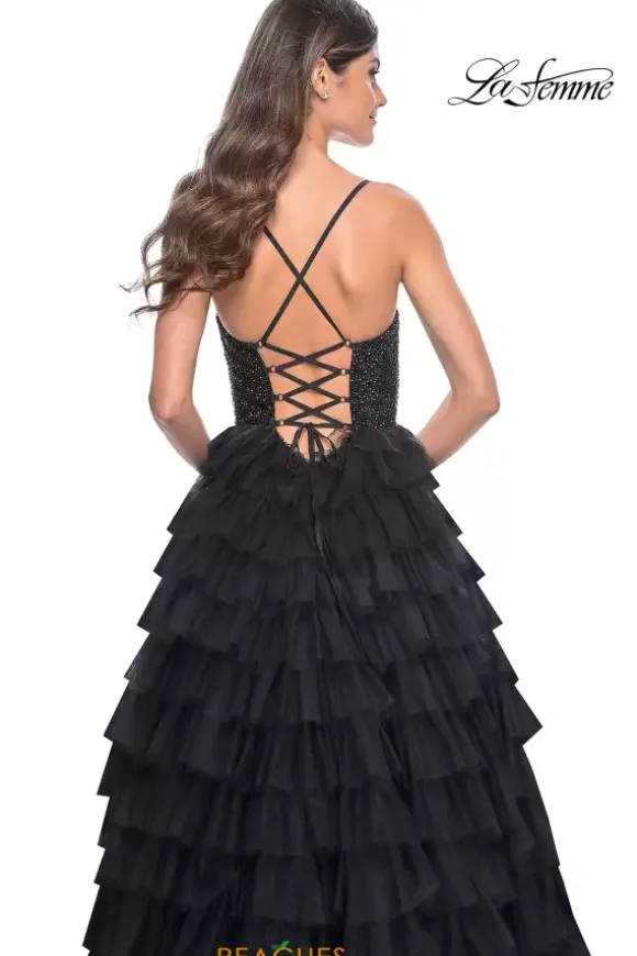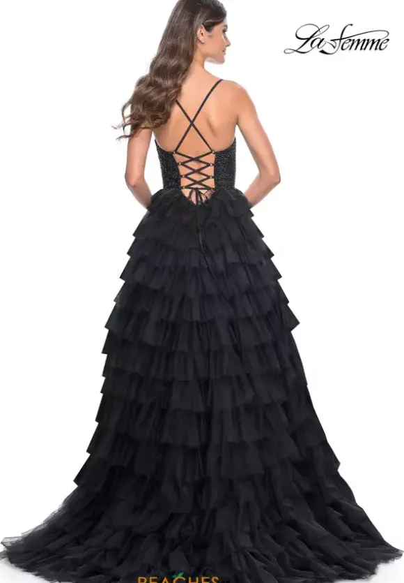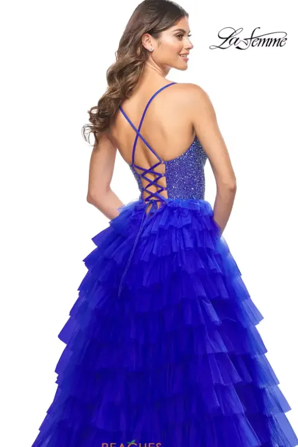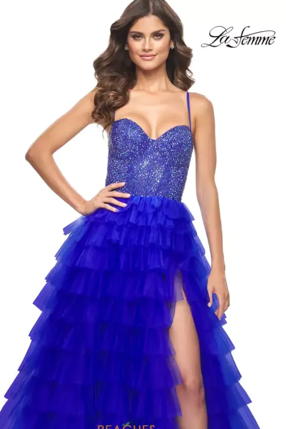 Be the showstopper at your event when you wear this alluring La Femme A-line prom dress 32002. This flattering A-line consists of a cinchable fully beaded corset bodice that hugs the small of your waist and gives you a radiant sparkle. The lavish tulle skirt creates a flattering silhouette and flaunts a thigh high slit.