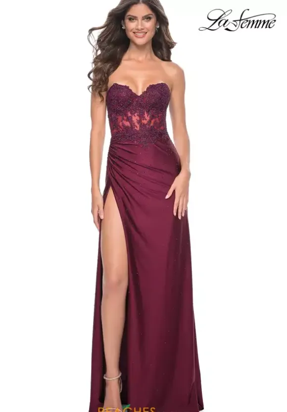 Be the most memorable in this unforgettable La Femme prom dress 32011. Elegant beaded lace adorns the strapless zip up corset bodice for a subtle shine and flattering ruching is featured along the seam of the Thigh high slit for an elegant touch. This gown is created with a classic sleek sweep train.