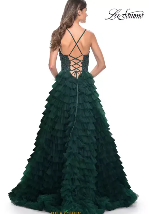 Make them stop and stare wearing the alluring long style 32128 by La Femme. The dazzling illusion bodice is adorned meticulously with lace applique and illuminating rhinestones. The entire skirt is made from tulle but falls into multiple layers of ruffles to really up the drama factor to your photos.