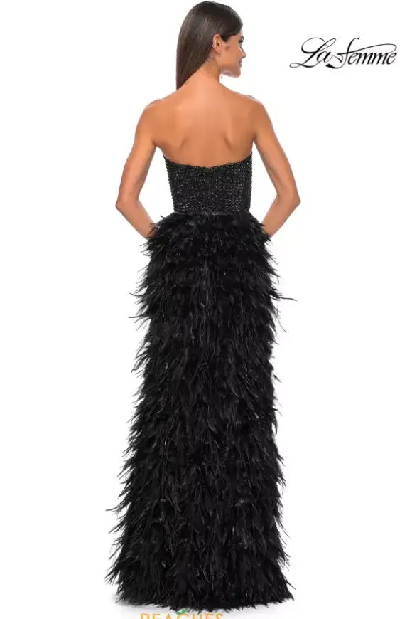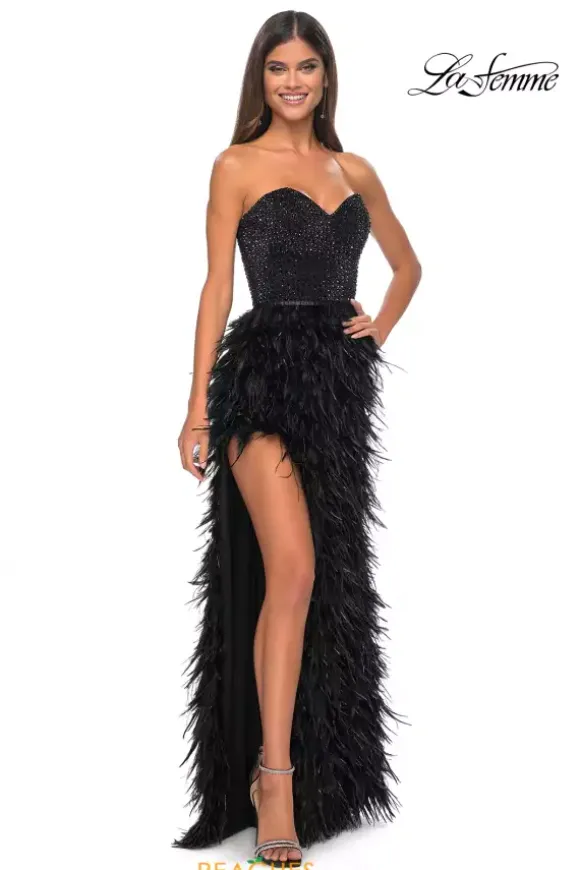 Refined feathered prom dress 32165 designed by La Femme is an ideal choice to wear to your event. This strapless sweetheart neckline zip up dress has a slim fit bodice that sculpts the small of your waist and is entirely garnished in shimmering beadwork. The shark bite slit skirt is embellished with soft feathers.