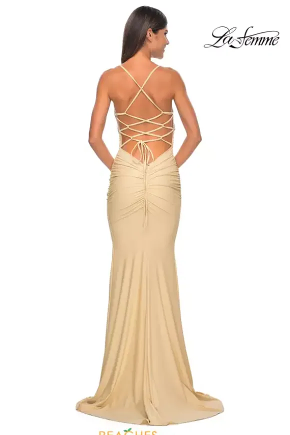 Show up and rock this gorgeous La Femme long dress 32320 for your special event. This stunning fitted silhouette showcases a flattering v neckline with simple straps creating an eye catching lace up open back. The fully beaded bodice adds the perfect amount of sparkle complimenting the simple jersey skirt.