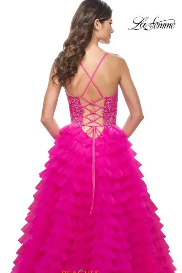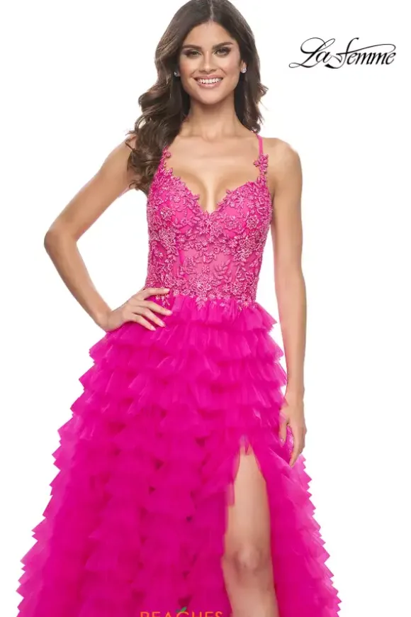 Feel like a fashion icon in this outstanding A line style dress by La Femme, style 32334. This fuchsia/ hot pink dress is made with very elegant lace and tulle and has a beautiful V shaped neckline. This ball gown dress has a perfect slit and corset lace up that makes this dress completely comfortable to enjoy the night in.