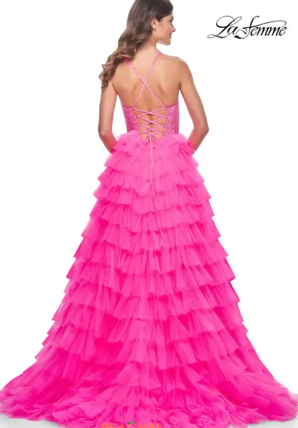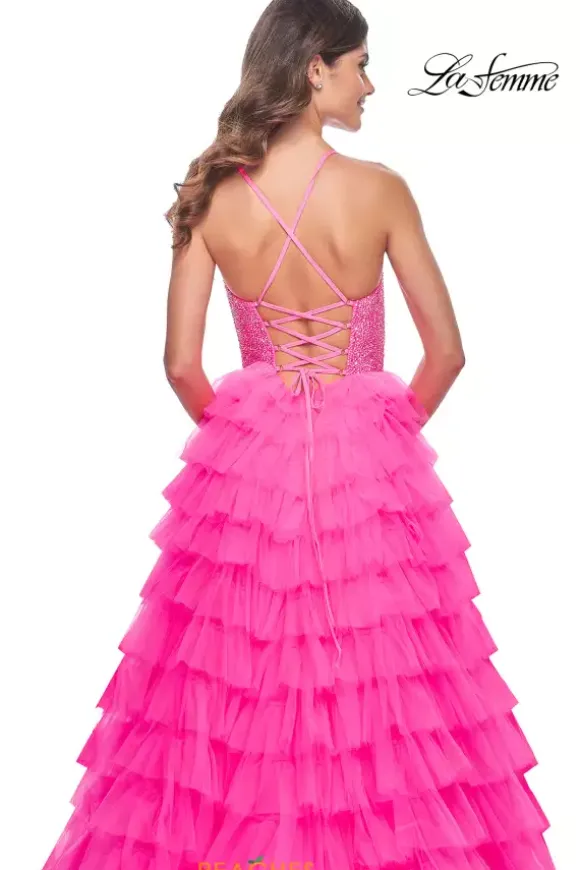 Look and feel like a modern day princess with this enchanting A-line La Femme prom dress 32335. Shine radiantly with an adjustable and fully beaded corset bodice that is further enhanced by the ruffle tiered tulle skirt that features a classic thigh high slit along with a sweep train that will gracefully sweep behind you.