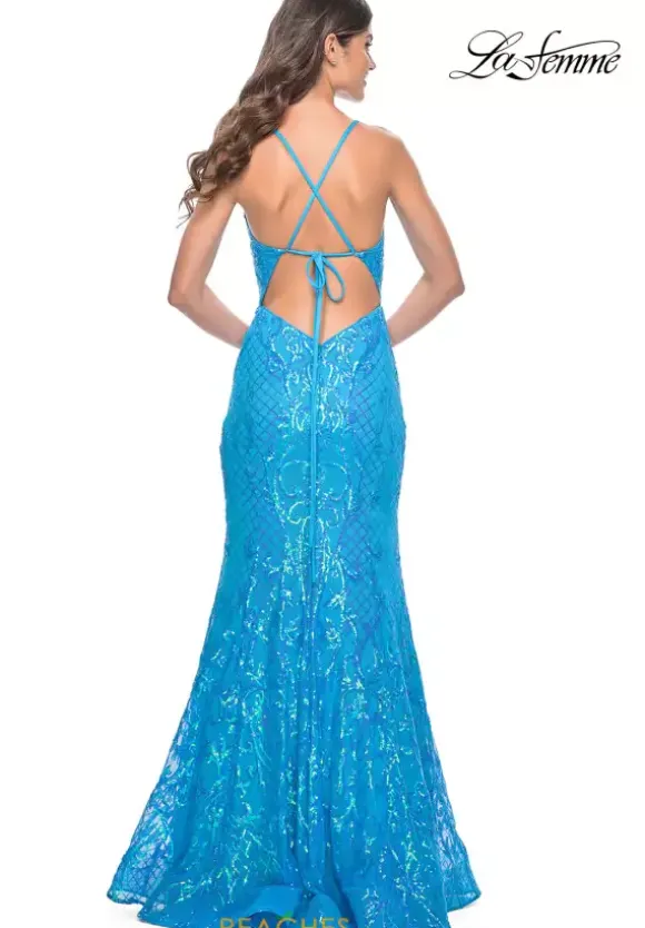 Look your complete best in this drop dead gorgeous fitted style dress by La Femme, style 32337. This long style dress is made with plenty of wonderful sequins that will have every single person at your event mesmerized with you. This open back dress comes in a various colors, some being an aqua, blue, and a purple.