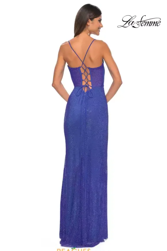 Perfect for prom, La Femme fitted long dress 32446 displays gorgeous beaded net material that makes this dress stand out, creating a sensational sparkling effect. The bodice showcases corset details and slim straps that cross in back leading to a convenient lace up to cinch the waist. A side slit further shows off the figure.