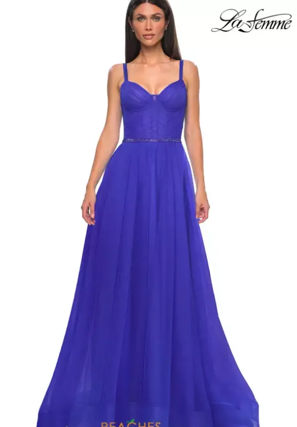 Look fabulous at prom in this understated La Femme ball gown style 32656 made in layers of tulle fabric. This chic silhouette features a sheer crisscrossed ruched structured corset with adjustable straps and rhinestone beaded waist band. The long, full, a line skirt has a horsehair hem edge, high front slit and small back train.