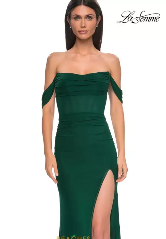 Wear this sleek and sophisticated La Femme long dress 32684 for your special event. This timeless fitted silhouette showcases a modest scoop neckline with elegant off the shoulder cap sleeves. The accentuating built in corset bodice and comfortable jersey skirt features a thigh high slit and sweep train.