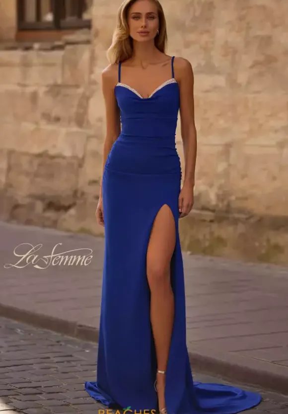 Show off your body when wearing this long a line dress by La Femme style, 32802. Showcasing a modern v- neckline thats embellished with glistening beadwork and delicate thin straps leading to an exquisite intersecting open corset lace up back that will hug your bodice phenomenally ending with a back zipper closure. Featuring a jersey bottom with ruching which will hug you nicely. To amp up the drama it has a classy high thigh slit and a lovely train.