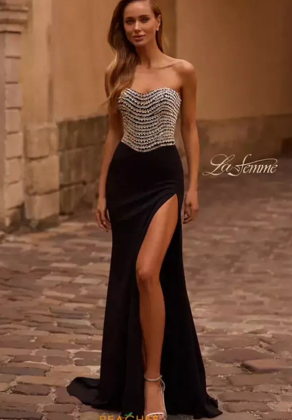 Shimmer all night long when wearing this long fitted dress by La Femme, style 32910. Featuring a modern strapless scoop neckline following a back zipper closure. Fully embellished with bedazzled beadwork designs throughout the top. Showcasing a sleek fitted jersey bottom that has a sexy thigh high slit. You will for sure going to have all the attention.