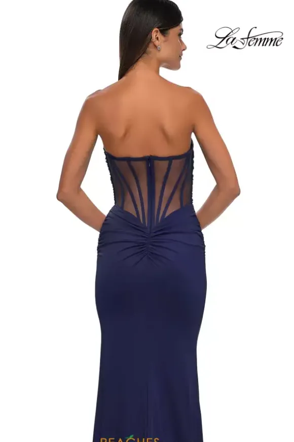 This exquisite long fitted dress by La Femme, style 32923. This precious long fitted dress by La Femme, style 32217. Showcasing a sweetheart neckline and sheer corset with a back zipper closure. The jersey material skirt will hug your body beautifully with a sexy slit and a sweep train.