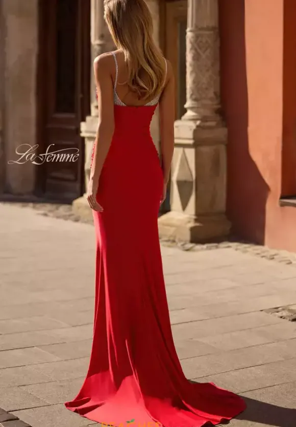 Look as if you are about to walk down a red carpet in this vibrant and long style dress made by La Femme, style 32939. This fitted dress comes in three lovely colors, including a ravishing red, a bold black, and a gorgeous royal blue. This V shaped neckline dress has some beaded detailing at the very top of the dress and the rest is made with phenomenal jersey style material.