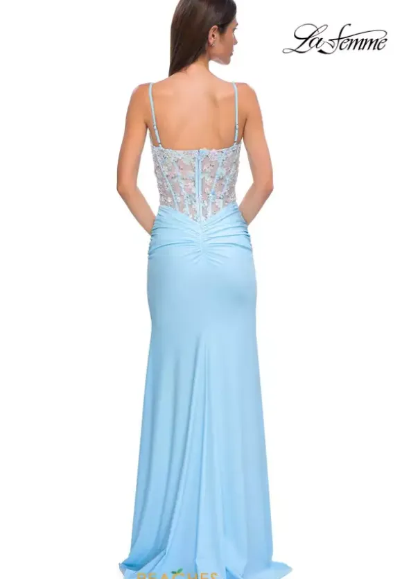 Embody a fairy tale princess when you decide to wear this beautiful dress by La Femme style 32957. This fitted silhouette features a deep v neckline with a mesh panel for modesty paired with adjustable straps and a back zipper. The floral sheer corset is the perfect amount of detail to match the the ruched skirt. The slit is paired amazingly with the sweep train.
