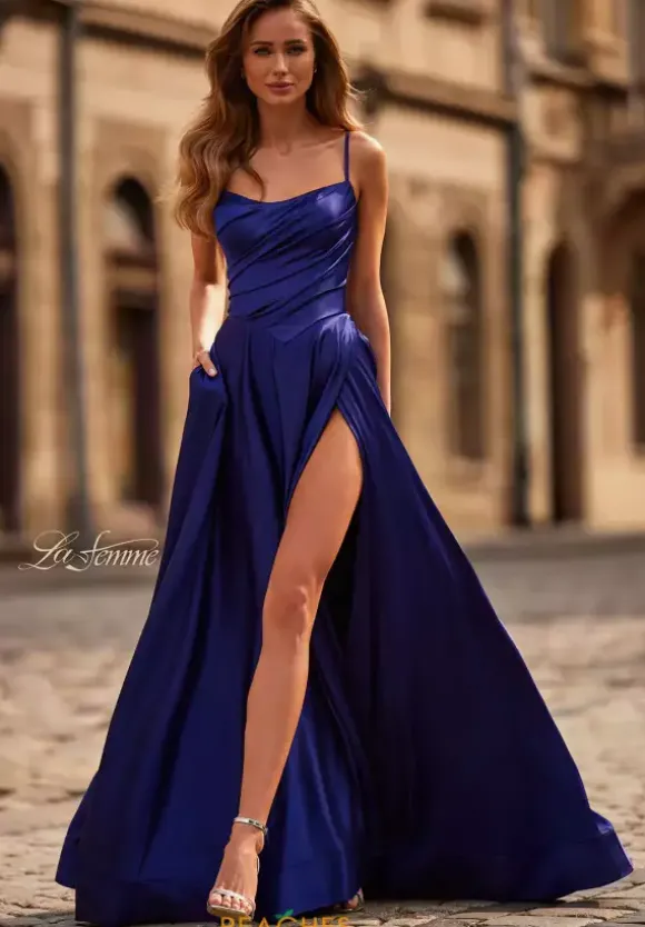 Simple sophistication exudes when you wear this fabulous La Femme long dress style 33373 made in lovely shades of satin fabric. This stellar gown features a fitted bodice with ruching with a scoop neckline, spaghetti straps and open lace up tie back. The long, a line skirt has hip pockets, crossover front slit and horsehair hem edge.
