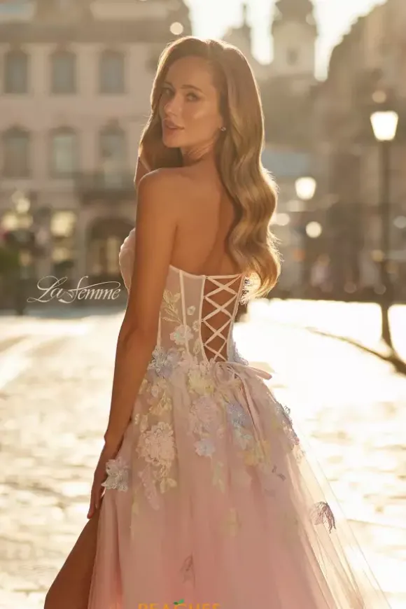 Your princess vibes will exude through this feminine charming La Femme light toned prom dress style 33432. An adjustable lace closure cinches the sheer panel corset bodice to your liking while the flared tulle skirt enhances your hips. Multicolored flower appliques adorn the strapless bodice and top of the tulle skirt to draw attention to the fierce high slit.