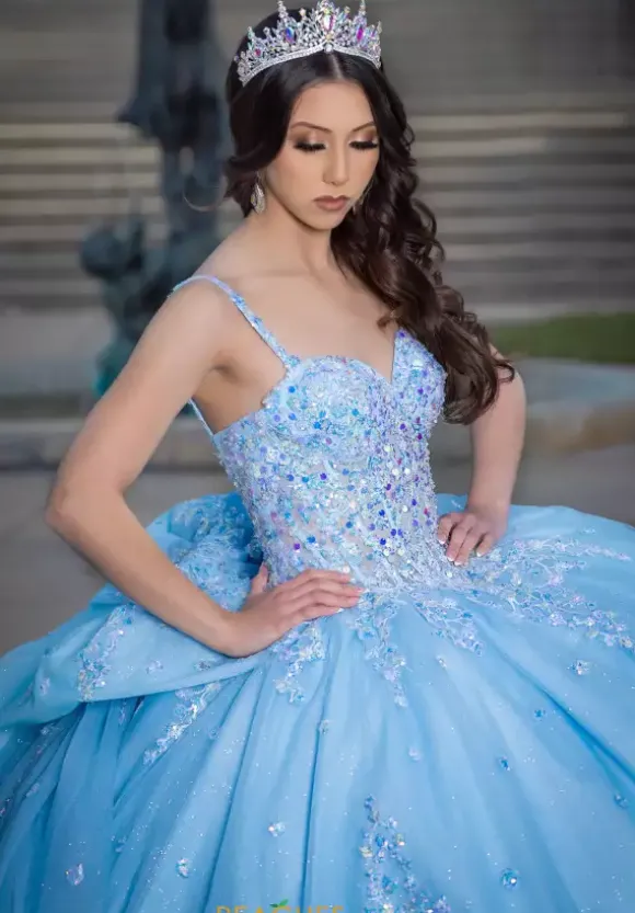 Be the center of attention when wearing this fabulous quinceanera dress by LizLuo Quinceanera, style 26086. Featuring a sweetheart neckline with delicate straps and puffy sleeves that are made out of tulle material adorned with floral applique. Following to a gorgeous corset lace up back that will hug your body beautifully. This ensemble is fully embellished with glistening beadwork patterns and lace throughout the dress. For the perfect final touch it has a long and unique train with a one of a kind bow.