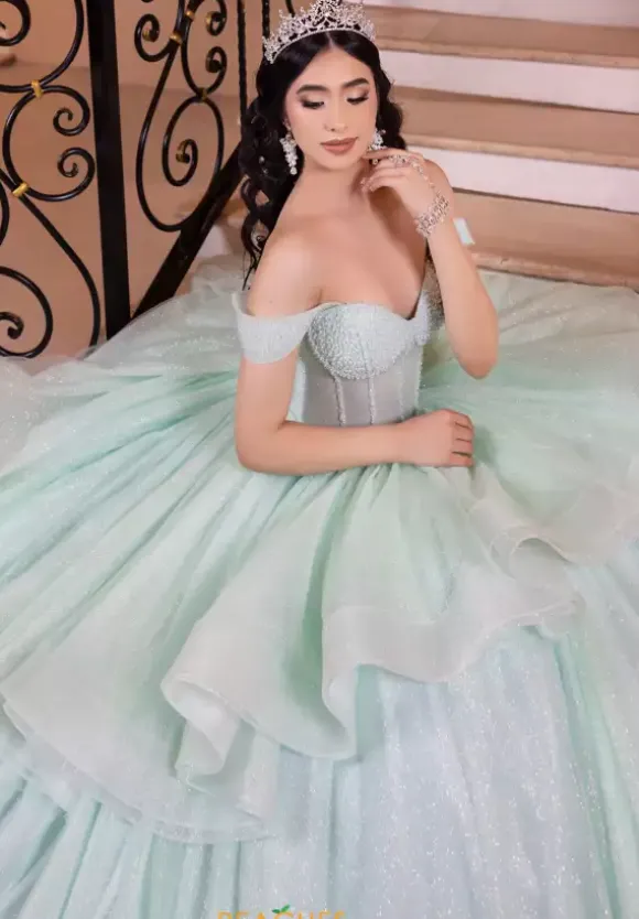 Step out of your comfort zone and show up wearing this high low Quinceanera dress by LizLuo, style 26103. Showcasing a sweetheart neckline with off the shoulder cap sleeves. The see through corset top of this ensemble is fully embellished with stunning beadwork and to make it pop out more it has ruffles going around the dress. The bottom sparkle tulle skirt is detachable, for the perfect final touch it has a beautiful train.