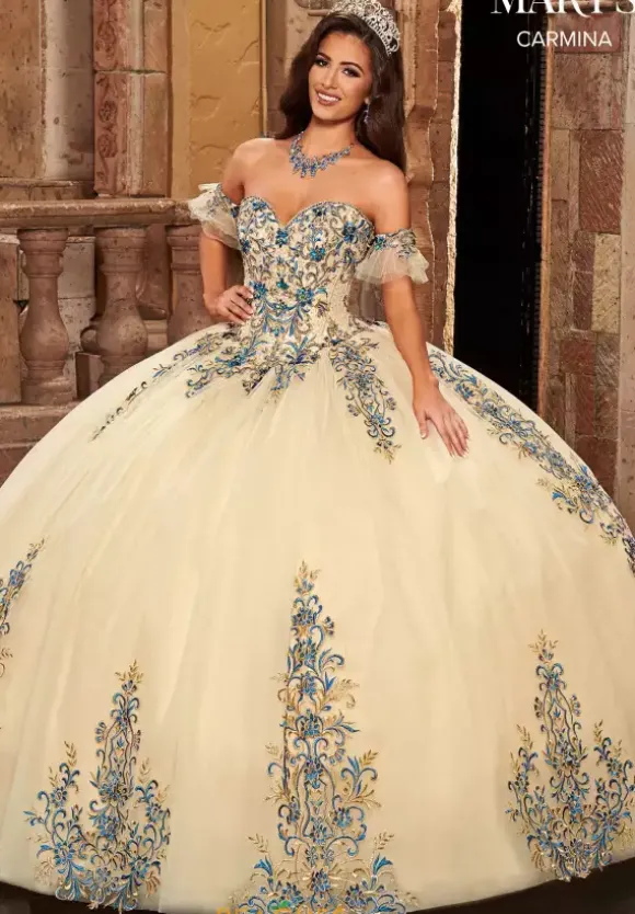 Dance the night away at your party wearing this elegant quinceanera dress MQ1087 by Mary’s. The ball gown silhouette showcases contrasting lace appliques that flow gorgeously from top to bottom. The corset style bodice has a flattering lace up back closure and pairs beautifully with detached cap sleeves.